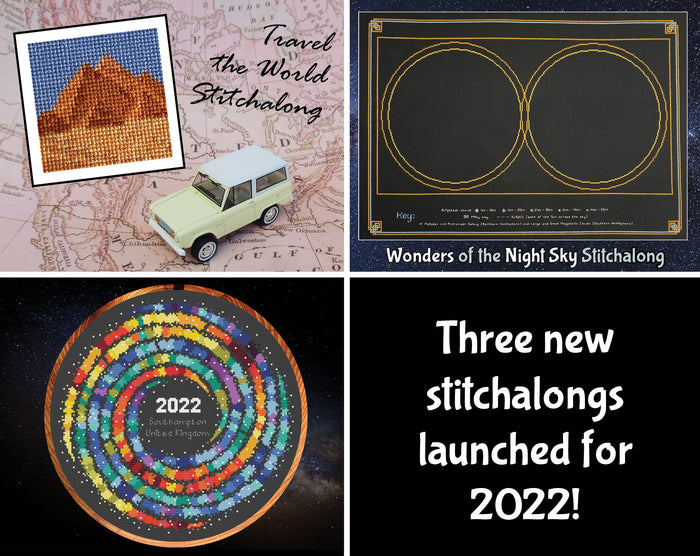 I'm excited to have just launched three new stitchalongs for 2022: my third space stitchalong, Wonders of the Night Sky, which charts the constellations; Travel the World, where you will tour every continent in the world through cross stitch; and the Rainbow Temperature Galaxy cross stitch pattern which you stitch according to the temperature through the year in your home town. You can see more details on all of them here: Stitchalongs
