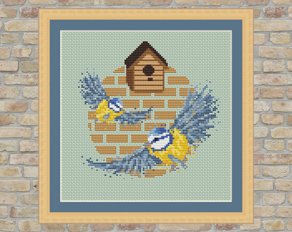 Cross stitch pattern PDFs of two splattered paint style blue tits flying out from a birdhouse against a brick wall. This fun pattern is full of life and movement for any nature lover!