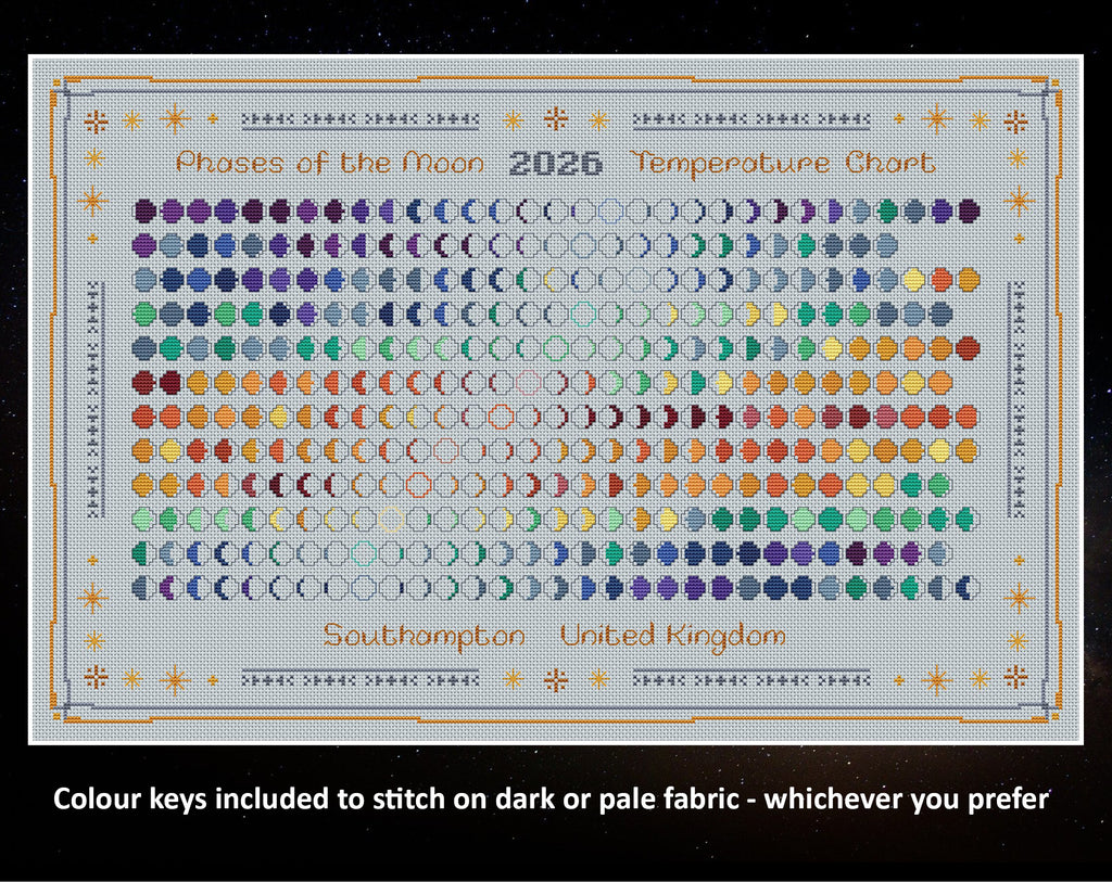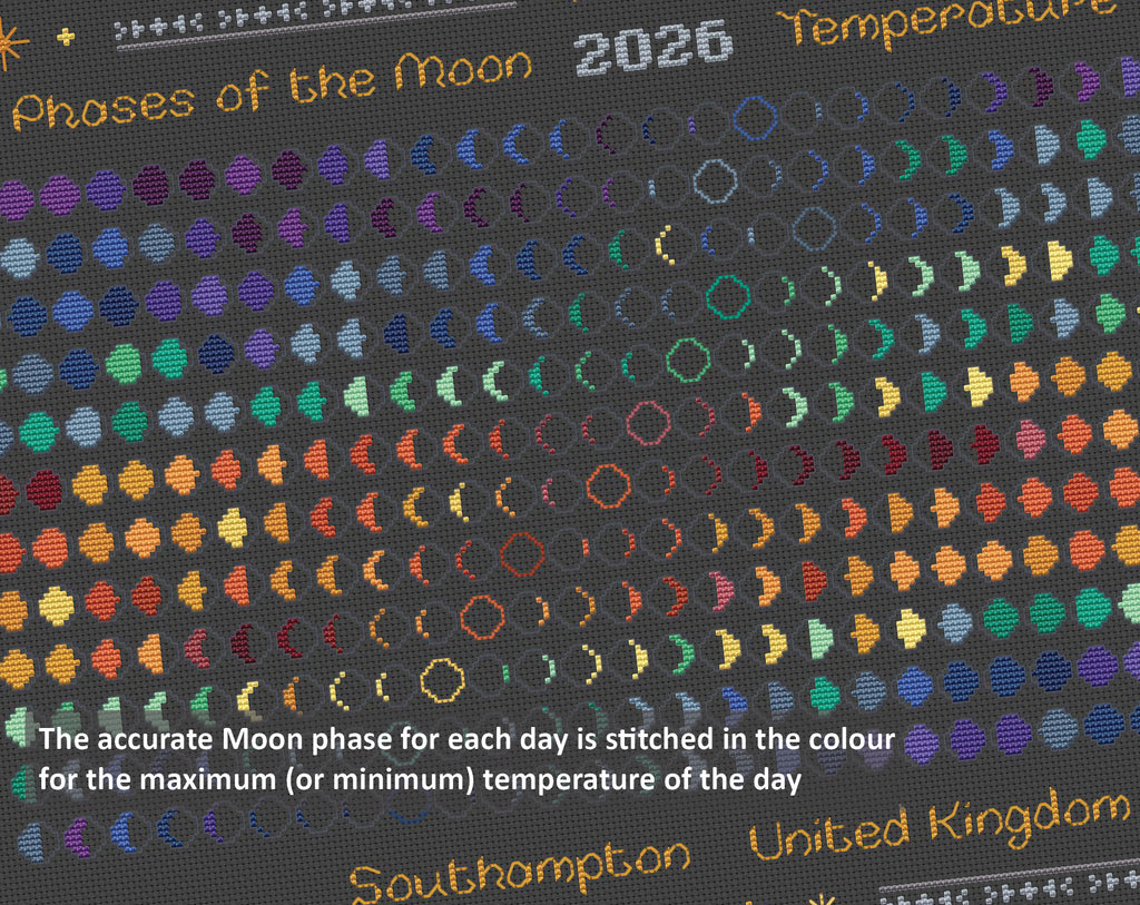 Note that unlike my other temperature patterns, this pattern is specific to 2026 only - the Moon phases will be different in any other year. This pattern also includes a set of complete temperature colour scales which are different to the colour scales used in my other temperature patterns.