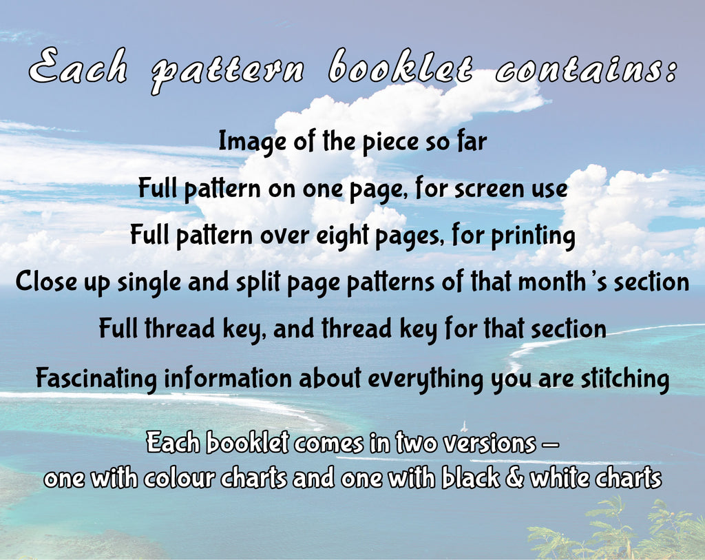 On each section release date you will receive two extensive pattern booklets, one with colour patterns and one with black & white patterns (with colour backstitch). The pattern booklets include split page and single page patterns of the whole charts; split page and single page booklets just of that month's section; and detailed information on every animal featured in the piece.