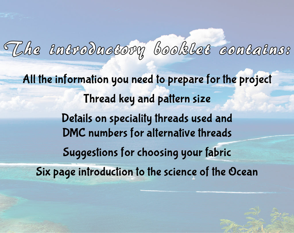 When you purchase the stitchalong, you will receive by instant download an introductory PDF booklet. The booklet gives all the information you need to prepare to stitch the pattern. This includes a thread list, pattern size, comments on choosing fabric and a written introduction to the science and wildlife of the oceans. You will also receive comprehensive stitching instructions.