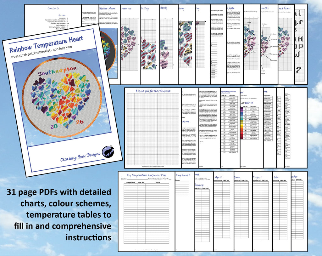 Very comprehensive instructions are included, explaining how to adapt the temperature colour ranges to almost anywhere in the world. You don't need to worry if you live in a hot or cold climate, or if the temperature goes between extremes - you will adapt the colours to your own temperature range, so that you will still stitch with colours across the rainbow palette. You can use either Fahrenheit or Celsius scales for your temperatures. A full alphabet and set of numbers is included so that you can personalise your piece for a different year and/or location.