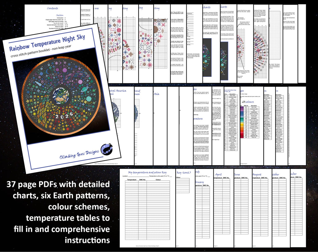 The Rainbow Temperature Night Sky cross stitch pattern booklets contain the charts and full instructions to cross stitch this piece in colours representing the maximum daily temperatures in your part of the world, through an entire year. The images show an example piece based on temperatures in Southampton, UK - the colour distribution in your piece will be different according to the temperatures in your area, so every piece stitched will be unique.