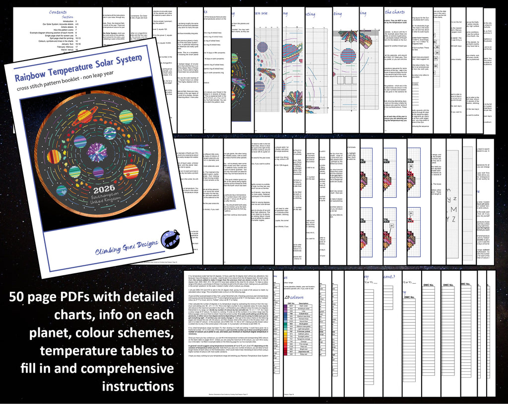 The Rainbow Temperature Solar System cross stitch pattern booklets contain the charts and full instructions to cross stitch this piece in colours representing the maximum daily temperatures in your part of the world, through an entire year. The images show an example piece based on temperatures in Southampton, UK - the colour distribution in your piece will be different according to the temperatures in your area, so every piece stitched will be unique.